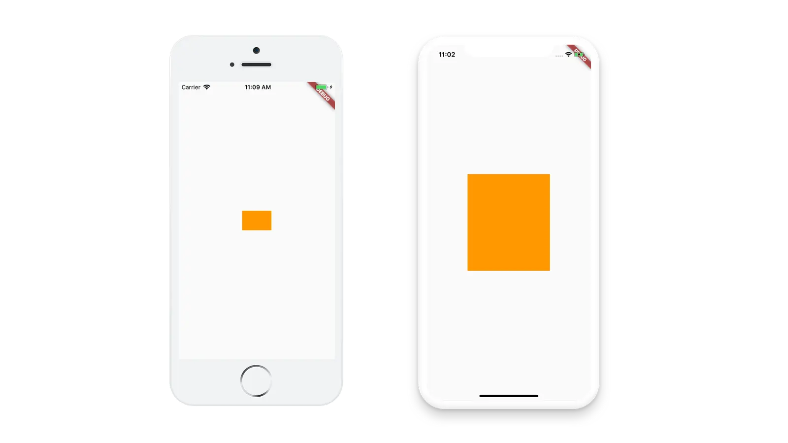 现在,我们就用 Container 实现了一个 40 * 60 的矩形,接下来看一下这个矩形在 iPhone 5s (4" Display) 和 iPhone XS Max (6,46" Display) 显示的样子: