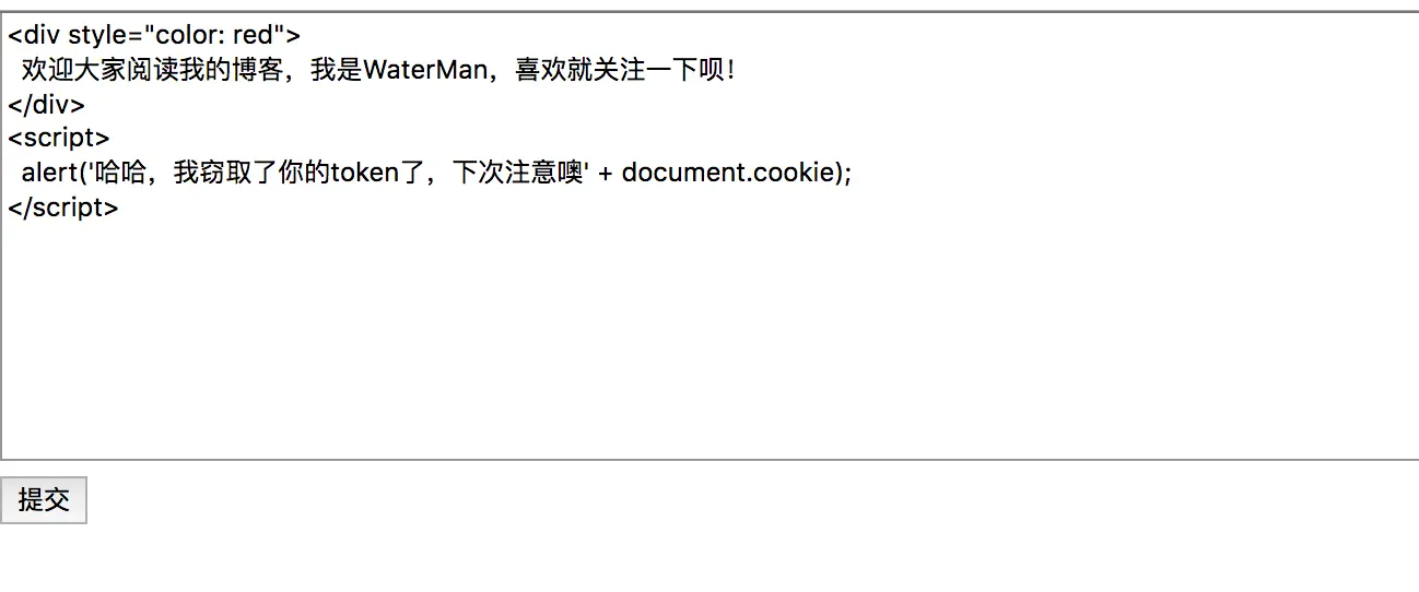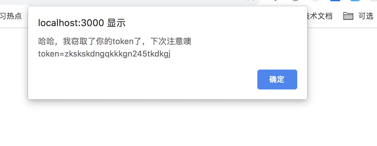alert('哈哈,我窃取了你的token了,下次注意噢' + document.cookie);