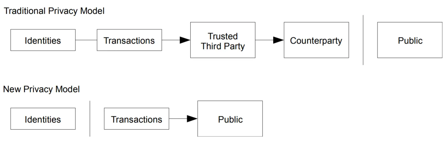 传统的银行机构通过限制外部对于交易信息的访问来保证客户的隐私安全,但是比特币的交易信息全都是公开的。因此,比特币保护隐私的方法是让公钥匿名,这样他人不知道交易双方身份。当然最好每次交易都使用新生成的密钥要进一步保护交易者身份