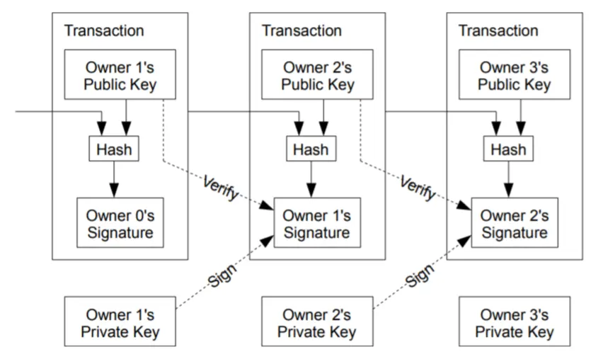 在比特币系统中,货币就是一串被签名的交易记录,货币通过交易进行流动。在每次交易中,将收款方的公钥和付款方用于支付的交易一起进行哈希,然后使用付款方的私钥对哈希进行签名后将电子签名加入倒交易之中。因为电子签名的存在,任何第三方都可以使用付款方的公钥验证这笔交易。