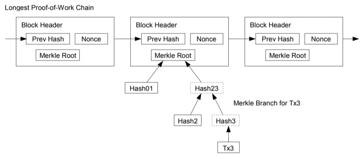 如果某些比特币的最新交易记录在非常深的区块链中,那么之前的交易都可以被清除来释放空间。为了保证这些交易记录被删除后,块的哈希值发生改变,区块链使用哈希树来保存所有交易的哈希值。在哈希树中,可以将交易删除,而只保留必要的用于计算最终哈希值的节点。
