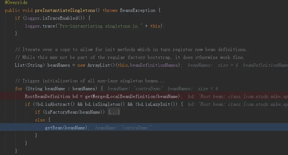 1.首先refresh()方法最后调用finishBeanFactoryInitialization(beanFactory)执行初始化bean工作,然后会调用DefaultListableBeanFactory.preInstantiateSingletons()。部分源码如下: