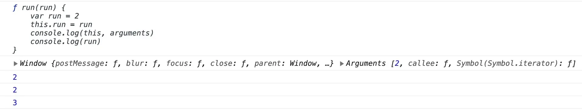 run。我们知道作用域原理是就近查找,存在一个屏蔽作用,run函数作用域中的run此刻就是2,所以第三个 log 会打印出2,this.run = run将全局中的run赋值为2 -