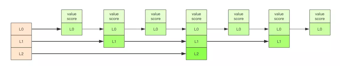 - 跳跃链表:层级制。最底一层是跳表的所有元素。每隔几个元素挑选出一个代表来,再将这几个代表用另一级指针串起来。然后再在这几个代表种每隔几个元素挑选出二级代表串起来,最终形成金字塔结构。跳跃是指,内部的元素可以在不同的层级之间进行「跳跃」。定位插入点时先从顶层进行定位,然后下潜到下一级定位,一直下潜到最底层找到合适的位置。(示意图引用自《Redis 深度历险》小册)