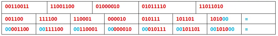我们把每3个字节划分成一份,然后再把它平均拆分成4份。最后剩余2个字节,则拆分成6+6+4的形式,16bit=6*2+2bit,如下表: