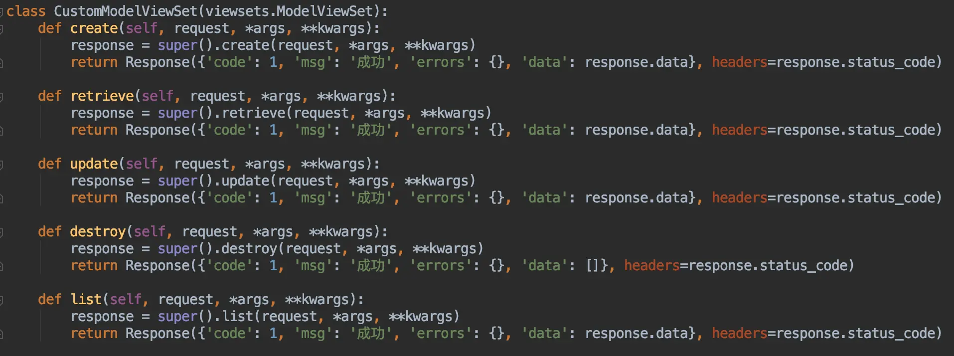 PS: 虽然做了上面的修改后,就修改了系统上大部分的返回信息,但是有时候我们需要定一个接口不是继承 ModelViewSet 的,这样这些修改就不能继承到了,在这样的情况下,每写一次接口,都要自己手动敲一遍这些信息,难免会手快敲错了,在这里我定义了一个类: