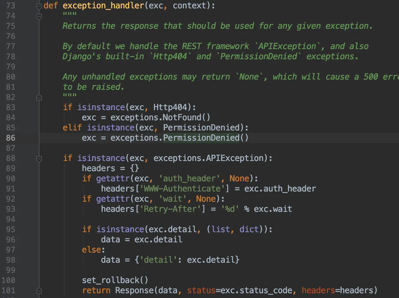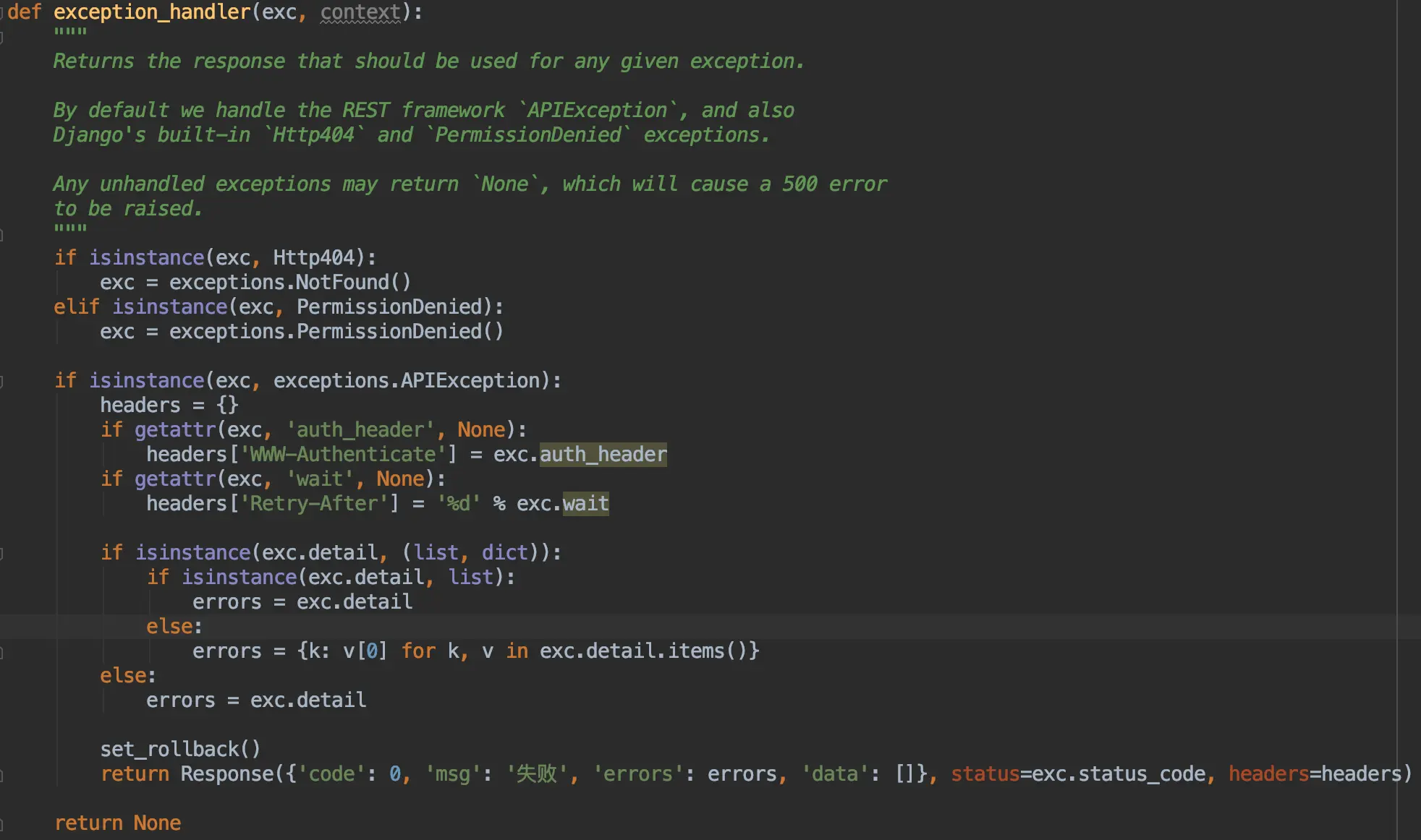 一顿调试后,我发现了当接口发生异常后,是由exception_handler这个方法去处理的。这个方法定义在rest_framework/views.py里,因为这个方法是独立出来的,不是定义在 ModelViewSet 里面,所以就没办法通过重写的方法来改了,我们把整个方法复制出来,放在CustomViewSet下面(当然没有规定要放在一起,放在哪里都行,方便管理就行)。