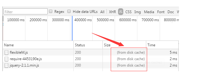 使用chrome的开发者工具,可以很明显的看到对于强制缓存生效时,网络请求的情况