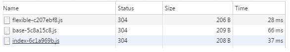 通过两图的对比,我们可以很清楚的发现,在对比缓存生效时,状态码为304,并且报文大小和请求时间大大减少。