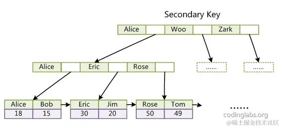 当通过辅助索引来查询数据时,需要进过两步:
