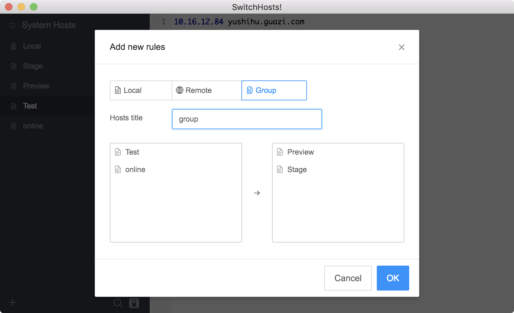 本地规则直接写在右侧空白处直接填写对应的IP和域名。