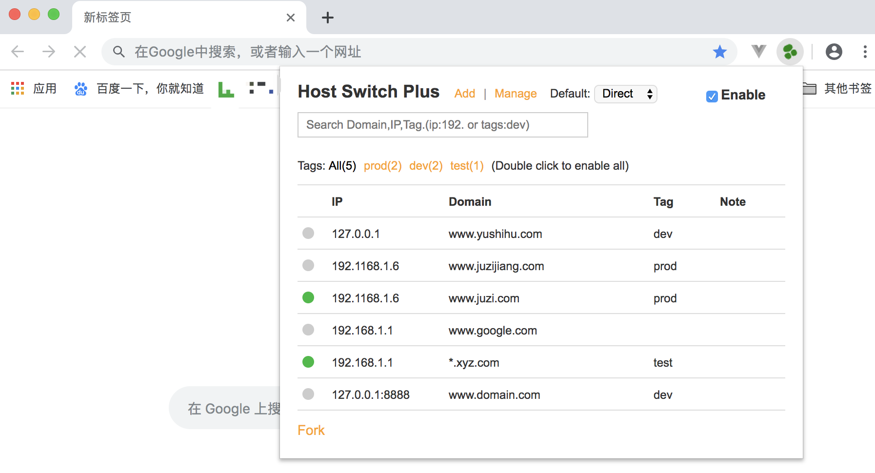 使用时,只要点击Chrome右上角的绿色图标,会以 Popup 弹层列出所有配置的 IP 和域名,可以实时的操作,一键开启和关闭,也可以点击 Tags,开启和关闭当前 Tags 对应的所有规则。