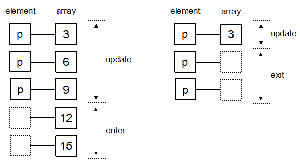 例子一:update和enter:update和enter:数组[3,6,9,12,15]绑定到三个<p>上。可以想象到,数组的最后两个元素没有可以绑定的元素,这时d3会建立两个空的元素与数组最后的两个数据相对于,那么这部分就称为Enter。而有元素与数据对应的部分就称为Update