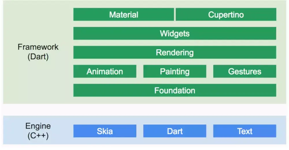 Flutter引擎层由Skia/Dart/Text三个部分构成,这一块使用C++开发。