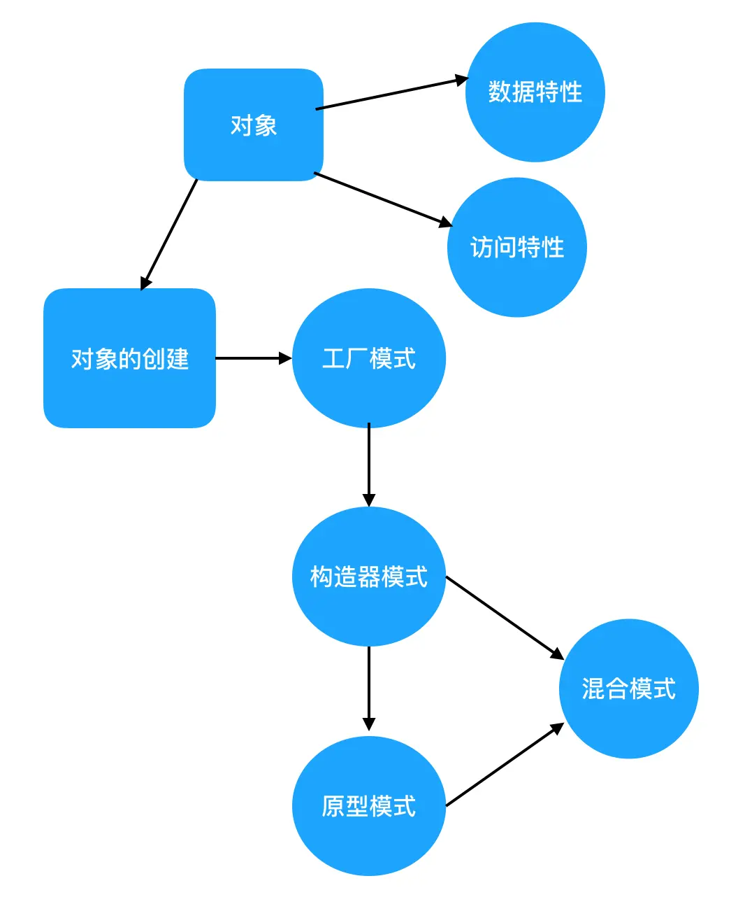 回过头去看一开始的那张图就觉得特别有意思,知识不再是一个个的点,而是相互之间有关联的。最初我们只有对象这个概念,但是这样不方便管理,于是我们给对象添加了一些特性,类似访问权限之类的约束条件;随后我们发现创建对象仅使用简单的赋值法并不方便,于是我们需要借助函数,一开始是工厂模式,但是它不够通用化,也不能简单直观地反应出对象的类型,于是就有了构造器模式,但是构造器模式下创建对象会对所有成员都进行一次复制,这其实是没有必要的,同一类的对象也是需要共享资源的,就像 Java 中的静态成员变量一样,JavaScript 中的对象也需要一个所有同类对象都能共享资源的方式,于是原型出来了,但是貌似原型只能是共享,还是和构造函数做一个结合吧,需要共享的共享,不需要共享的单独创建,于是我们有了最终的混合模式。
