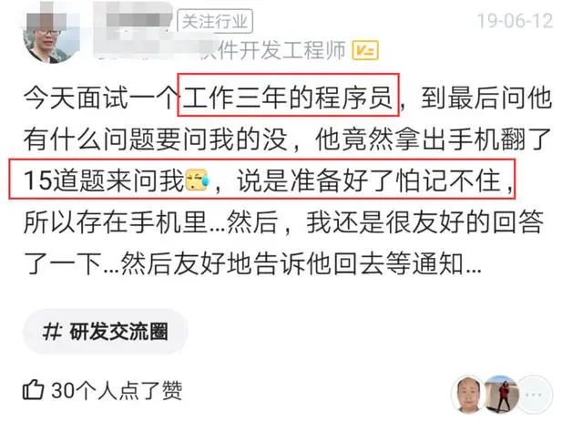 原来这个程序员在国企工作了3年,只是技术能力很一般。只是在面试的后半段,这个程序员居然拿出了手机,从里面翻出了15道技术题来问面试官。当时这个领导都蒙了,问一二个技术题还可以理解,问这么多又是什么意思呢?搞错了吧!