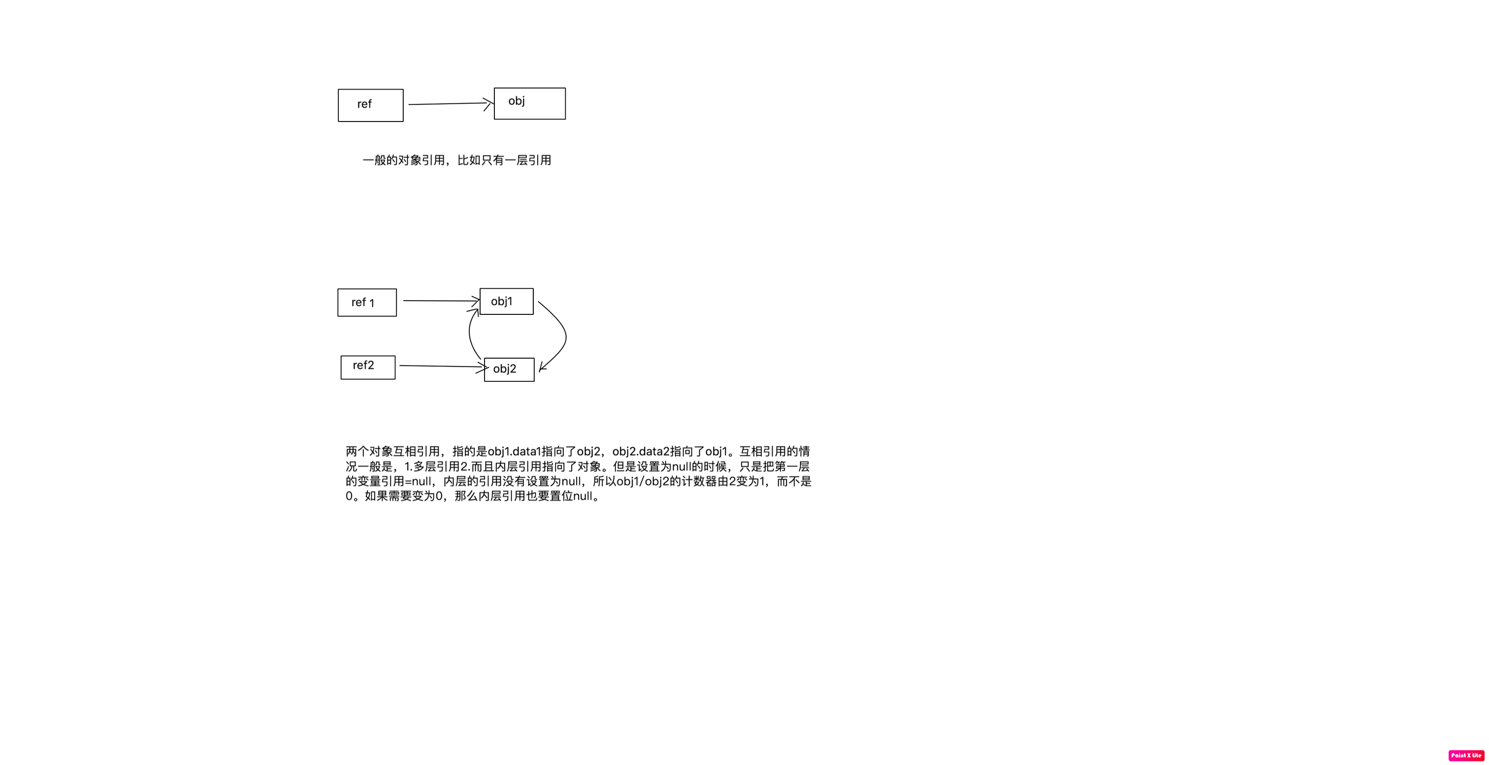 objA = null; //光是置空null第一层引用,不能释放对象,因为减1之后的值是1。如果想要释放,还需要把内层的引用也置为null,比如ref1.data=null。
