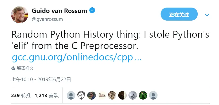 6 月 22 日,Python 之父 Guido 发了一条推特,说了 Python 的一则历史故事,他说 elif 是从 C 语言中偷过来的: