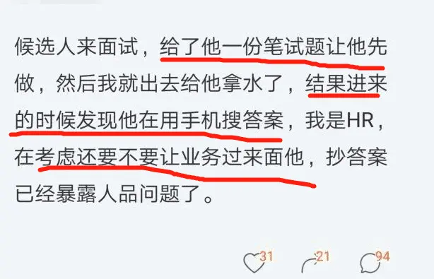 小张刚大学毕业后,就收到了一家大型互联网公司的面试邀请,刚收到这份面试邀请的时候,小张非常的激动,在面试的前一天晚上,小张把自己所学的重要的只是点都看了一遍,希望自己面试的时候能够顺利通过。当天小张早早的就来到了面试的公司。随后,面试官面试,面试官了小张一份笔试题让小张先做,然后面试官就出去给小张拿水了,小张这时遇到了难解的题,看面试官不在就拿手机搜了一下,结果这一幕刚好被面试官给看到了。面试官表示作为公司HR,在考虑还要不要让业务过来面小张,面试官认为抄答案已经暴露小张的人品有问题了。