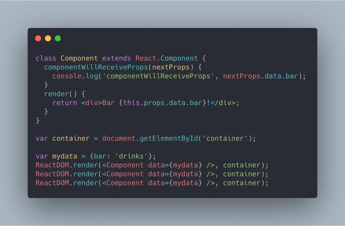 如果你不相信,用相同的props调用ReactDOM.render()三次,试着预测一下componentWillReceiveProps会被调用多少次