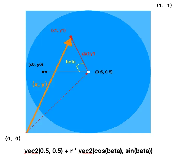 所以vec2(Res/2.0, Res/2.0) + r*vec2(cos(beta), sin(beta))也就是最终的向量(x,y),如下图所示: