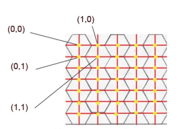 如上图,画出很多长和宽比例为3 :√3的矩形排列,然后对每一个点进行编号。 假如我们的屏幕的左上点为上图的(0,0)点,则屏幕上的任一点我们找到它所对应的那个矩形了了。