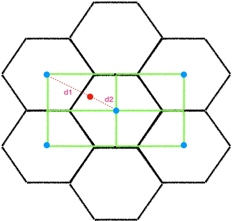 观察上图,标出了四个矩形,通过观察可以了解到,屏幕上的任意点(x, y),对应哪一个六边形,只要找到点,对应上面哪个矩形的关键点越近便可,而矩形坐标为(wx, wy),那么要判断(x, y)在那个矩形的关键点近取决于什么呢?