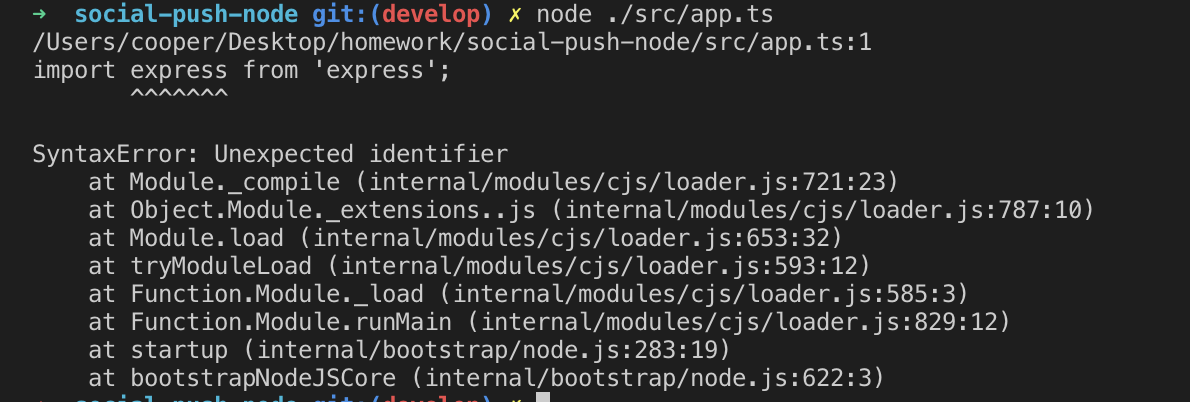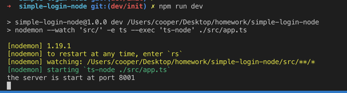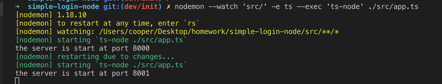 安装完成后,我们使用 nodemon 监控 /src 下所有 ts 文件的改动,当改动发生后,使用 ts-node 直接重新app.ts。命令如下: