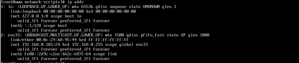 TYPE=”Ethernet” BOOTPROTO=”static” #静态连接 NAME=”ens33” UUID=”1f093d71-07de-4ca5-a424-98e13b4e9532” DEVICE=”ens33” ONBOOT=”yes” #网络设备开机启动 IPADDR=”192.168.0.101” #192.168.59.x, x为3~255. NETMASK=”255.255.255.0” #子网掩码 GATEWAY=”192.168.66.2” #网关IP DNS1= 8.8.8.8 DNS2=8.8.8.4 -