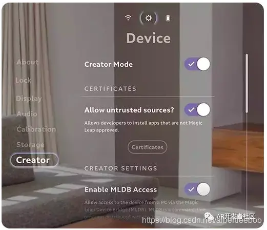 Allow untrusted sources?: 让设备加载未经Magic Leap批准的应用程序。注意:应用程序仍然必须使用Creator门户的证书进行签名。