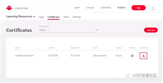 5.生成证书后,单击证书旁边的download按钮下载.cert文件。