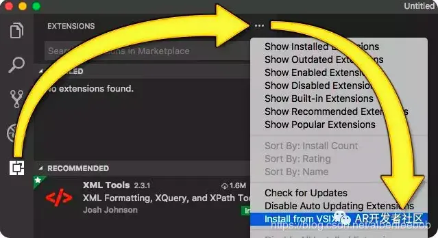 4.单击……图标,单击Install from VSIX,然后选择Visual Studio代码扩展名. VSIX文件。通常情况下,路径是 /Users/user/MagicLeap/tools/visual_studio_code/vx.x.x./ mlextension-x.x.x.vsix ,如下图: