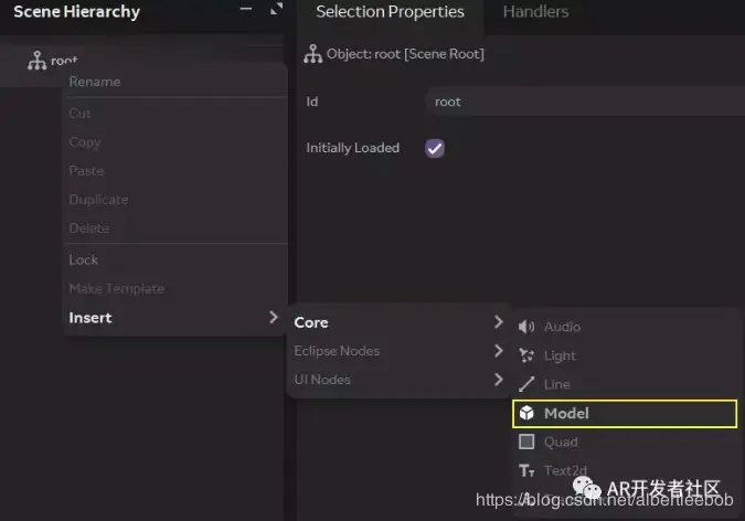 1.在场景层次结构中,右键单击root。然后插入一个模型。点击Insert > Core > Model。如下图: