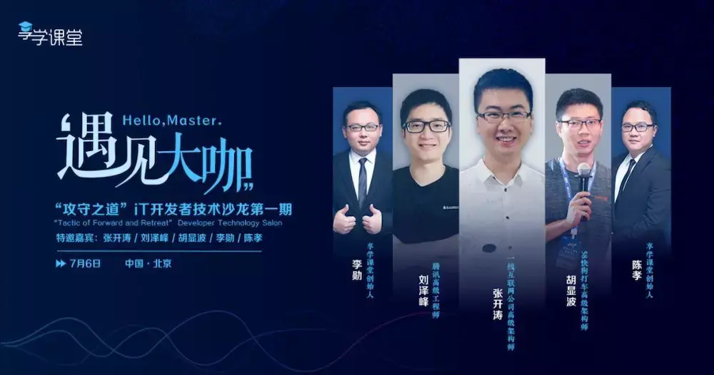 7月6日,由享学课堂主办的“遇见大咖·攻守之道”IT开发者技术沙龙第一期即将在北京中关村软件园二期举行。我们特邀一线互联网公司知名架构师、畅销书籍《亿级流量网站架构核心技术》作者张开涛、腾讯高级工程师刘泽峰、58快狗打车高级架构师胡显波等三位IT界知名大咖嘉宾向数百位开发者分享自己的技术知识和从事互联网工作以来的职场经验。届时三位嘉宾以及享学课堂创始人Lison、James将与数百名开发者共同探讨互联网技术的攻守之道。