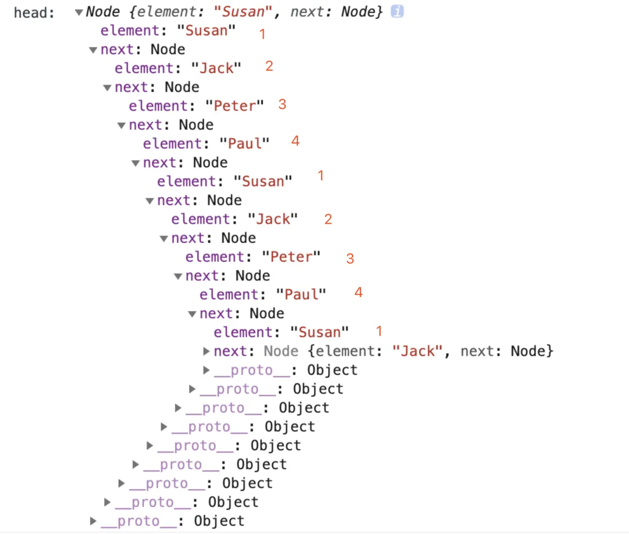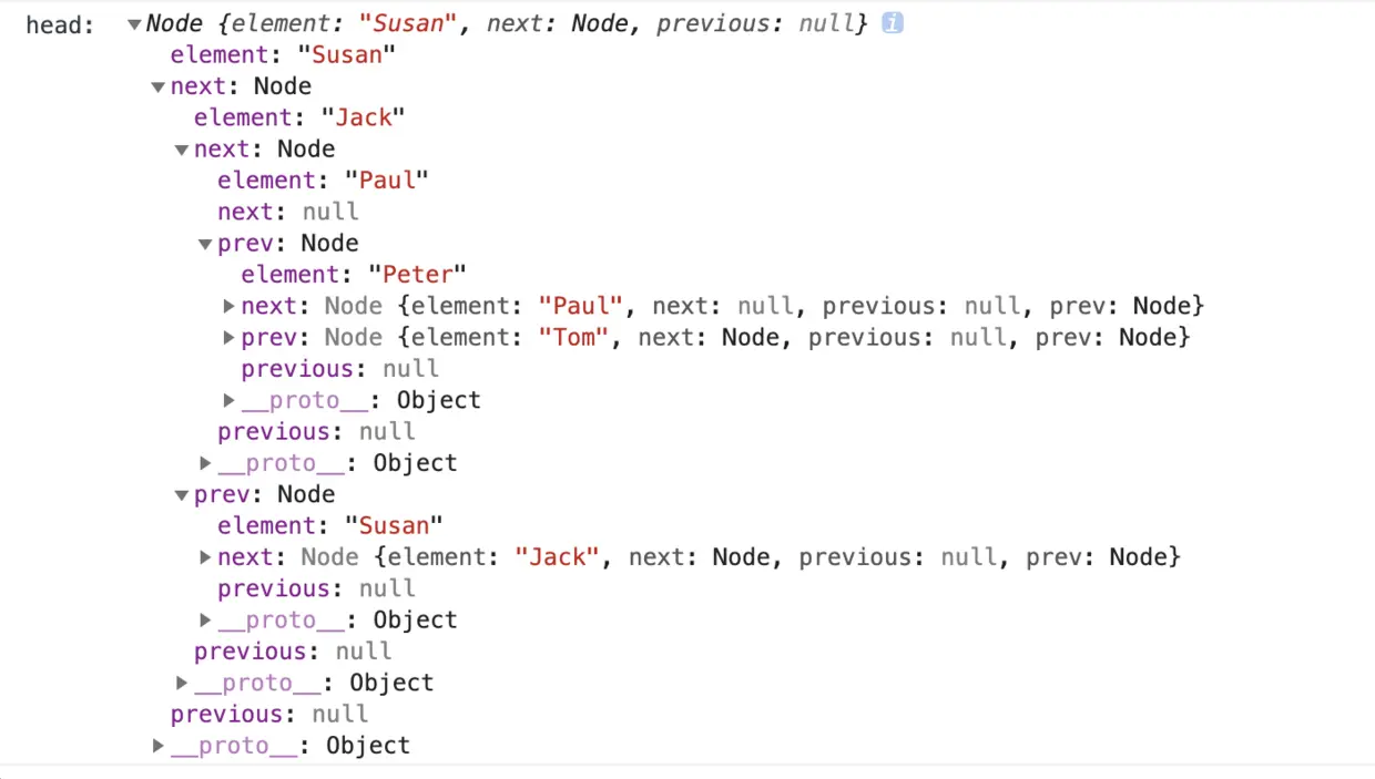 circularLinked.print(); // "Susan,Tom,Peter,Paul"