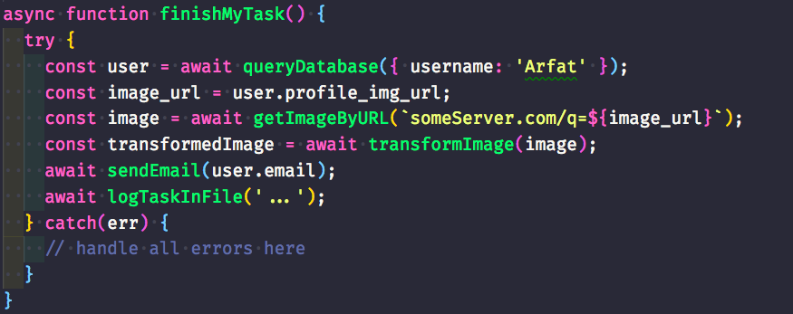 我们定义了一个 async 函数 finishMyTask,使用 await 等待 queryDatabase, sendEmail, logTaskInFile 函数执行返回结果