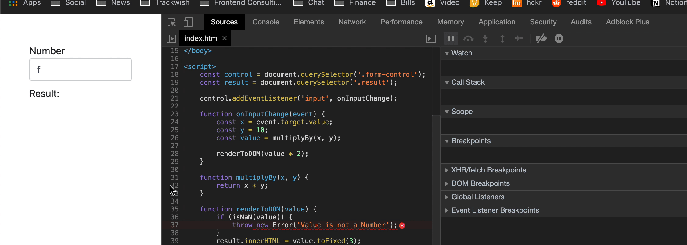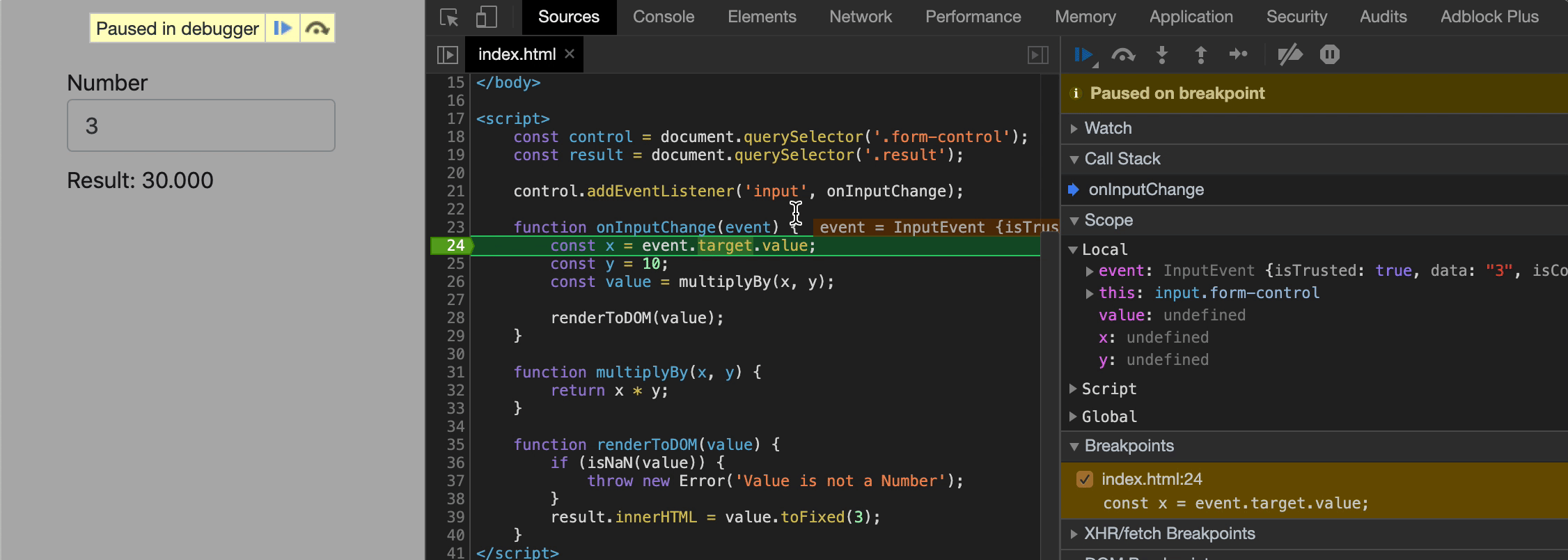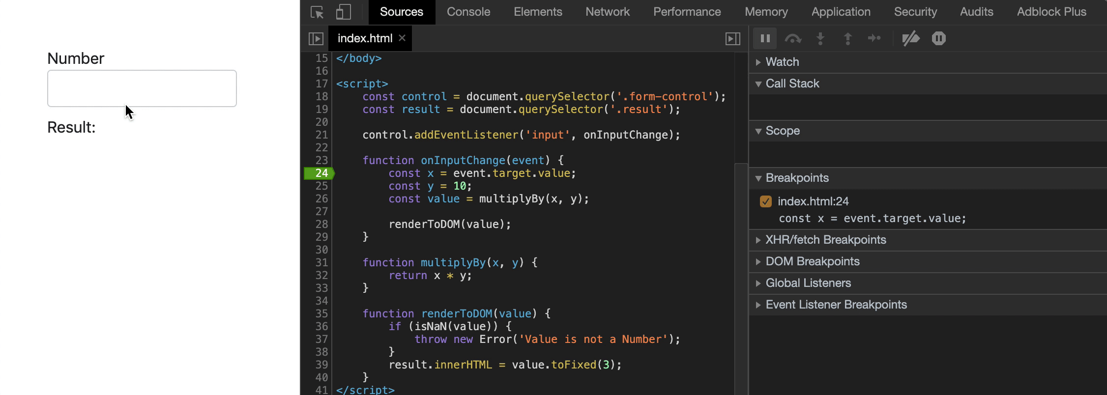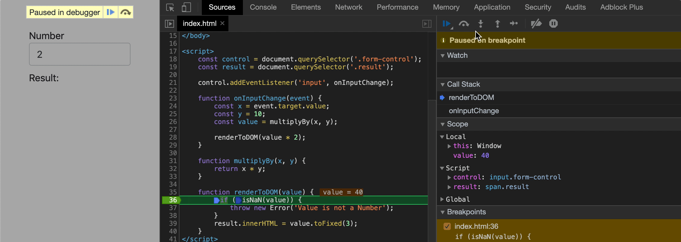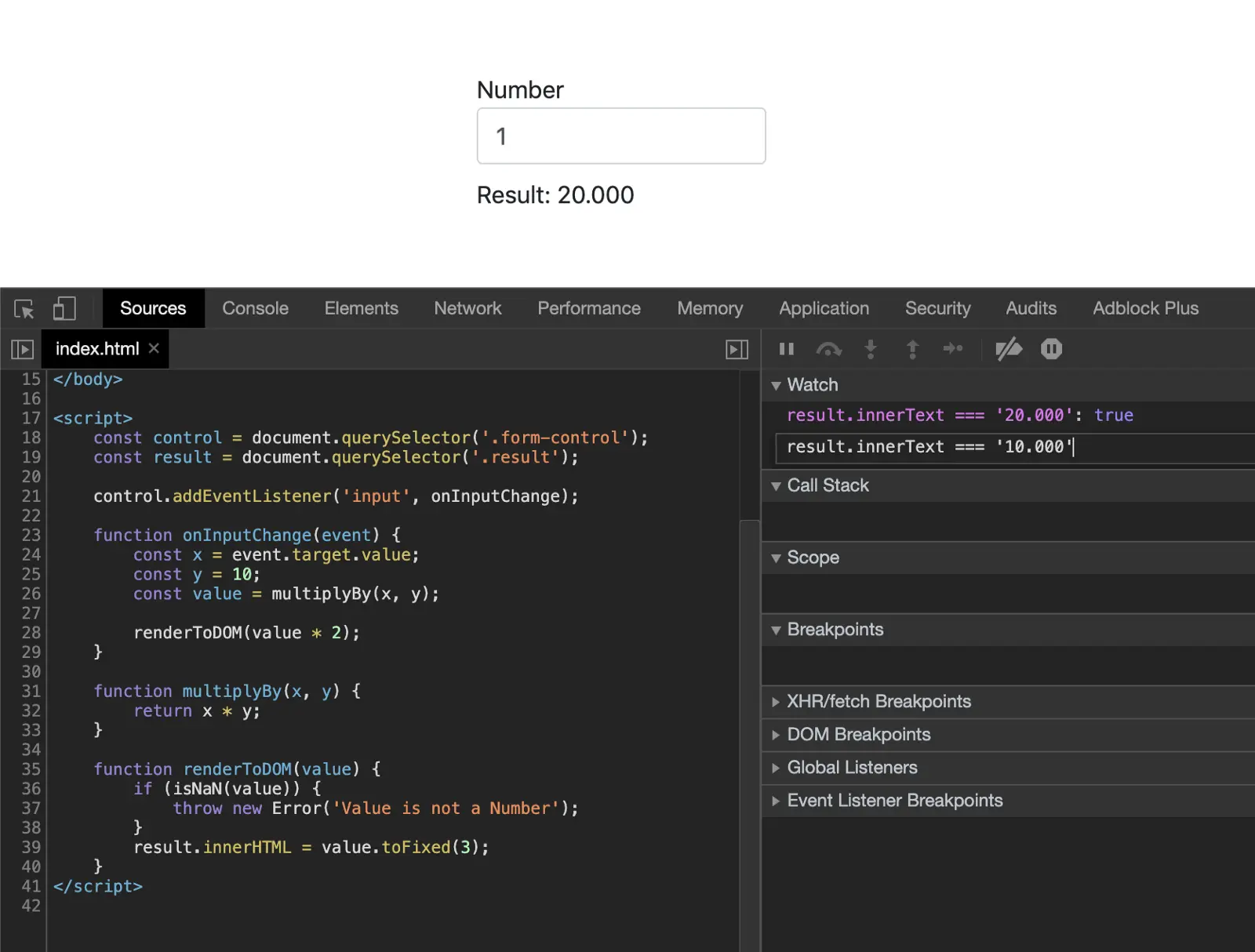 假设我们有一个简单页面和一个输入数字的脚本,并在页面上呈现数字乘以10.我们将调用两个函数:一个用来做乘法,一个用来将结果渲染到页面中。