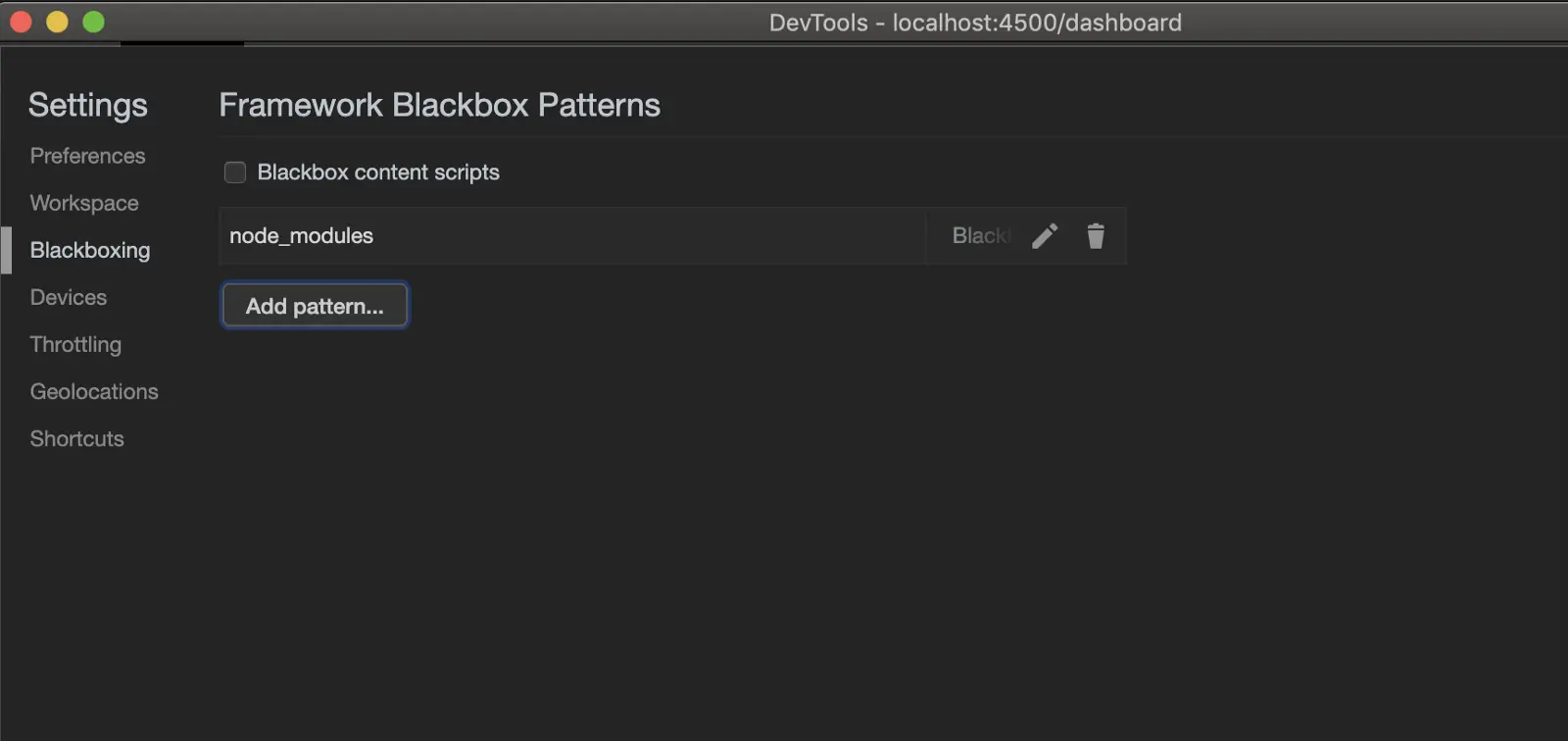Add Pattern...并输入您想要加入 Blackbox 的正则,在您想要过滤大量脚本时很有用。