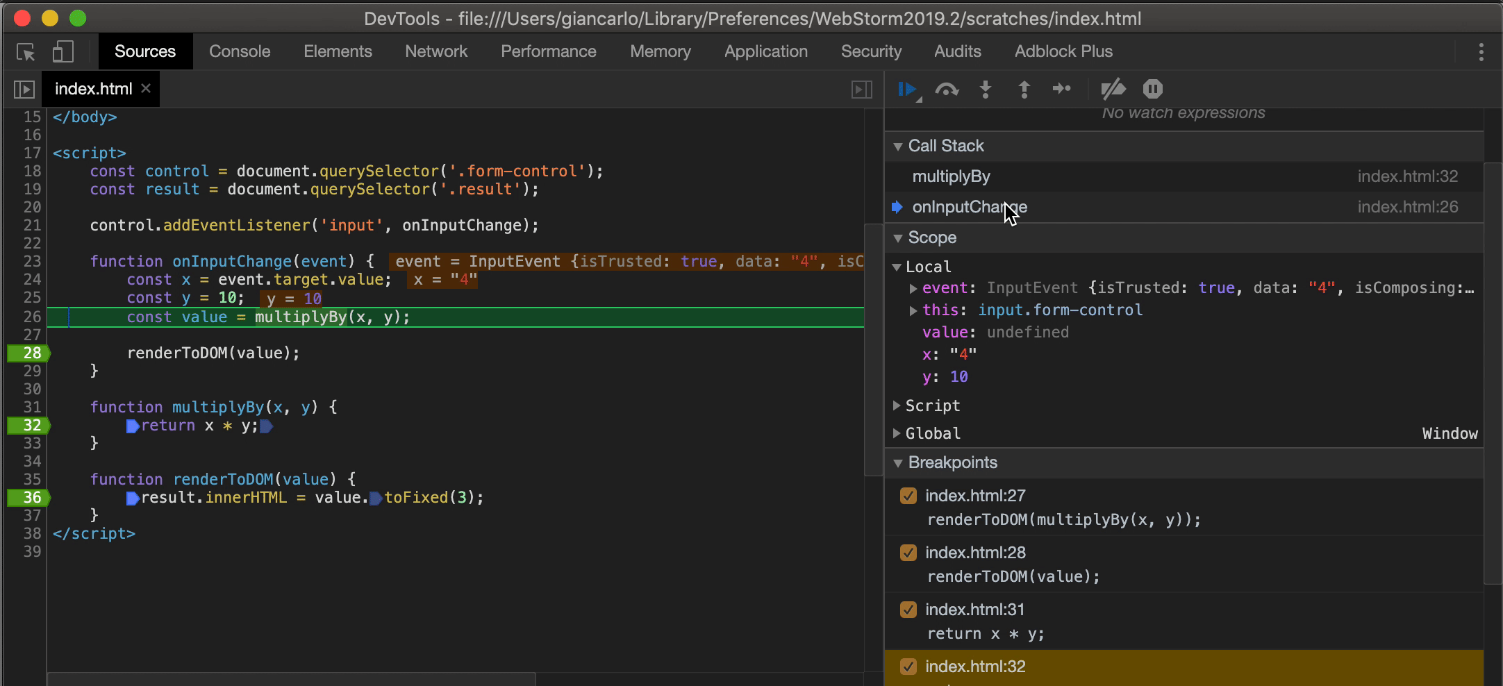 查看调用堆栈是开发者工具提供的最有用的工具之一:您不仅可以在调用它们的函数中来回跳转,还可以在每个步骤检查它们的作用域。