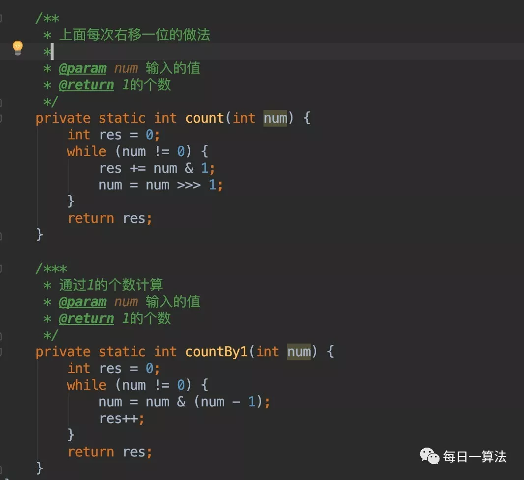 1:最简单的解法,把整数n每次都无符号向右移动一位,检查最右边的bit位是否为1来统计,当n=0的时候,也就是循环完成的时候。