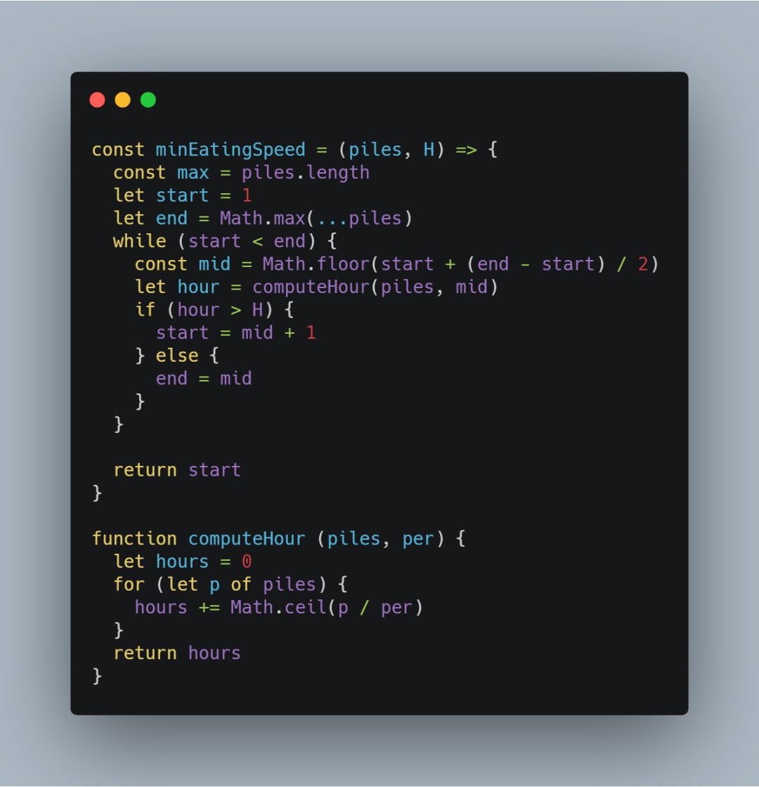 这道题要求我们找出一个最慢吃香蕉的速度,使得在 H 小时可以吃完 N 堆香蕉。