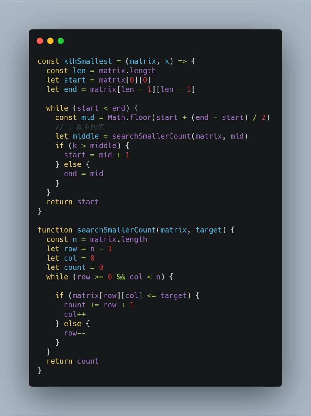 题目要求计算出第 k 小的元素,那么从有序数组中挑选出来的中间数并不能直接与 k 进行比较,需要在二维空间中找出当前中间数是第几小的数字,再与 k 进行比较: