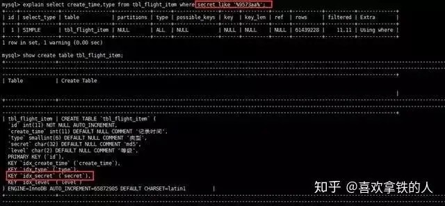 如下图所示,虽然给 secret 字段添加了索引,但在 explain 结果并没有使用: