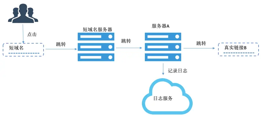 在这个方案中,真实的链接经过三次跳转,第一次跳转到短域名服务器,第二次跳转到中间服务器,在中间服务器上记录日志,第三次跳转到真实的目标地址。