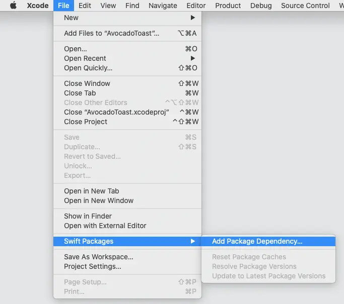 Then we add SwiftWebUI as a Swift Package Manager dependency. The option is hidden in the “File / Swift Packages” menu group:
