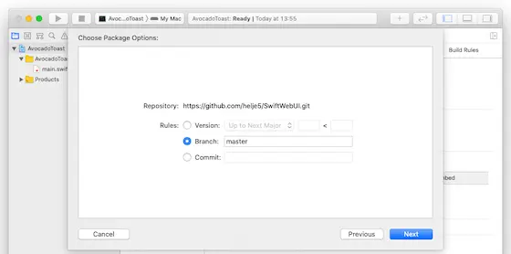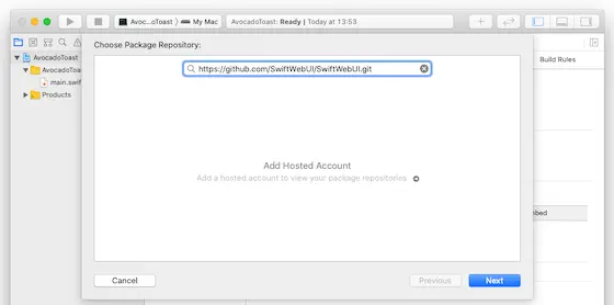 Enter https://github.com/SwiftWebUI/SwiftWebUI.git as the package URL:
