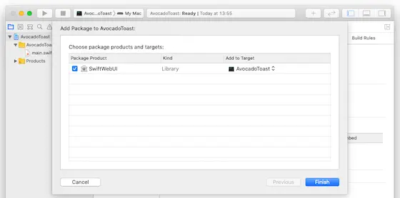 That’s it. You now have a tool project which can import SwiftWebUI. (Xcode might take a moment to fetch and build the dependencies.)