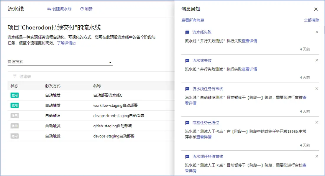 - 部署流水线模块流水线部分新增站内信消息用于通知流水线相关人员去执行对应的操作。