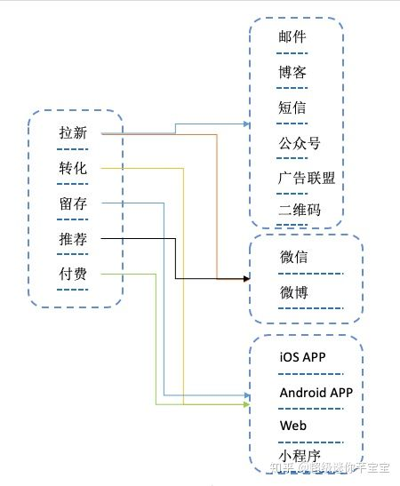 通常,我们要分析拉新的的转化率,产品的留存率,以及用户推荐和最终付费相关的所有指标,每种类型的指标对应的渠道如下图所示。