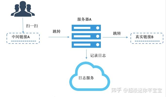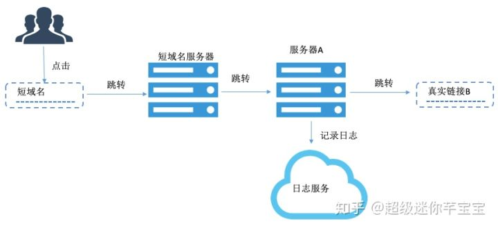 在这个方案中,真实的链接经过三次跳转,第一次跳转到短域名服务器,第二次跳转到中间服务器,在中间服务器上记录日志,第三次跳转到真实的目标地址。